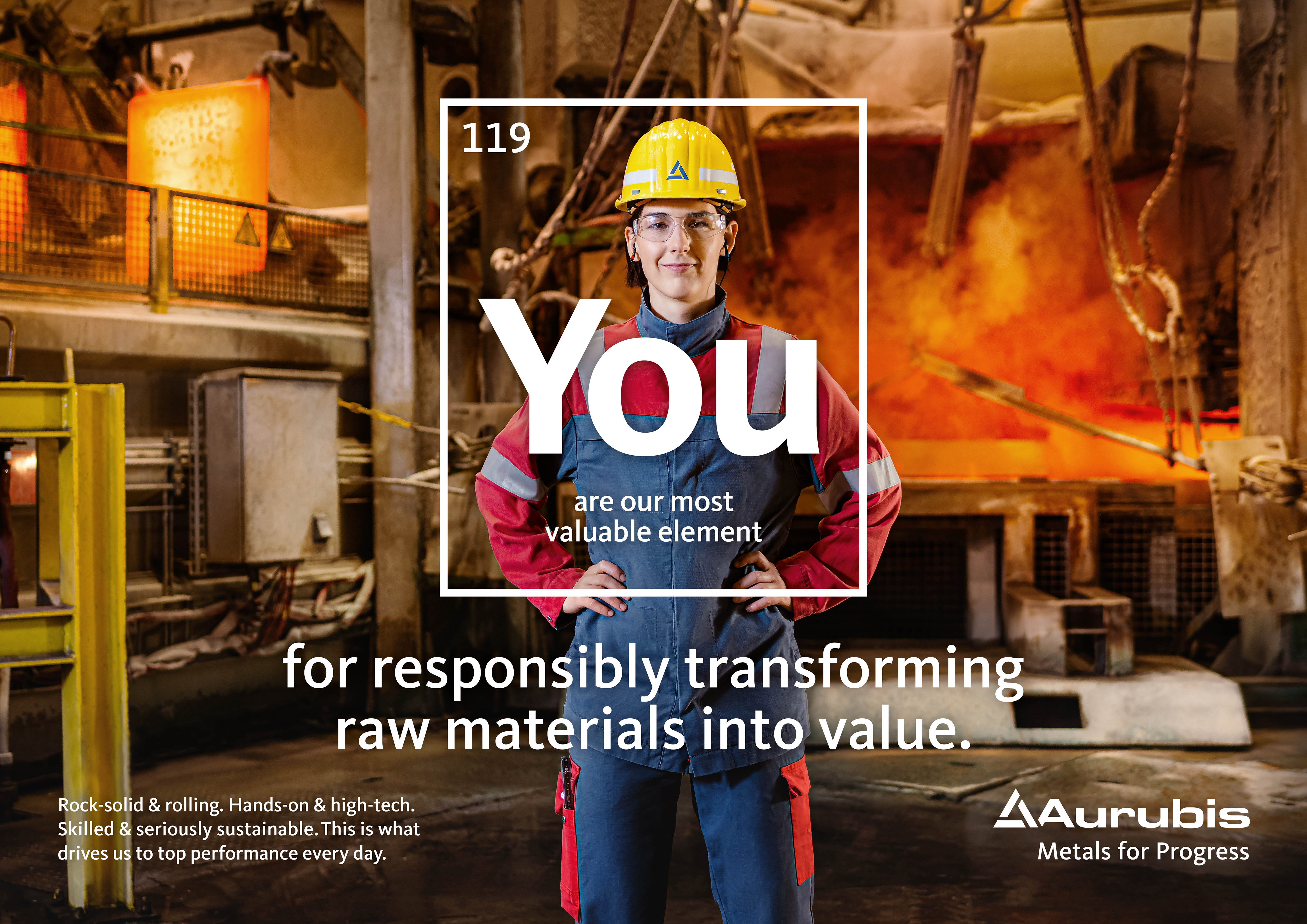 The design concept of the new employer brand draws on the pivotal factor of the company’s contribution to society, among other aspects. It shows the diversity of Aurubis employees in a broad variety of work environments within the multimetal company. Based on the periodic system and its 118 elements, more than 35 images show employees as an additional 119th element. The "most valuable element" for making a decisive personal contribution to jointly overcoming important challenges of today and tomorrow.